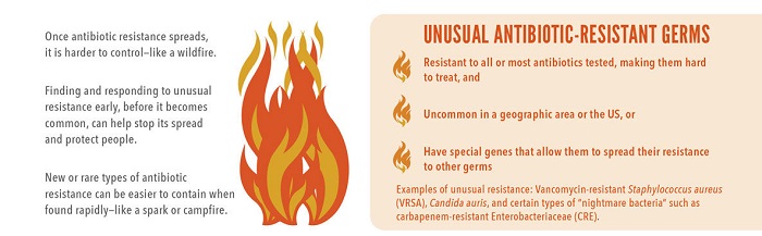 Examples of unusual resistance: Vancomycin-resistant, Staphylococcus aureus (VRSA), Candida auris, and certain types of "nightmare bacteria" such as carbapenem-resistant Enterobacteriaceae (CRE).